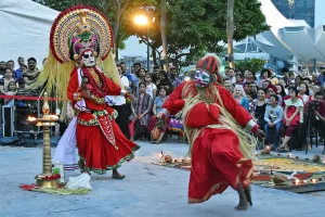Kuttiyattam is one of the oldest forms of Sanskrit theatre, practiced in Kerala for over two millennia. Known for its intricate and elaborate performance style, Kuttiyattam involves a highly stylized form of acting that draws from ancient Sanskrit texts. Performers, often dressed in ornate costumes and makeup, enact dramatic interpretations of classical Indian epics such as the Ramayana and Mahabharata. The theatrical art form is characterized by slow, deliberate movements and gestures, with performers often chanting in Sanskrit, creating a deeply immersive experience.